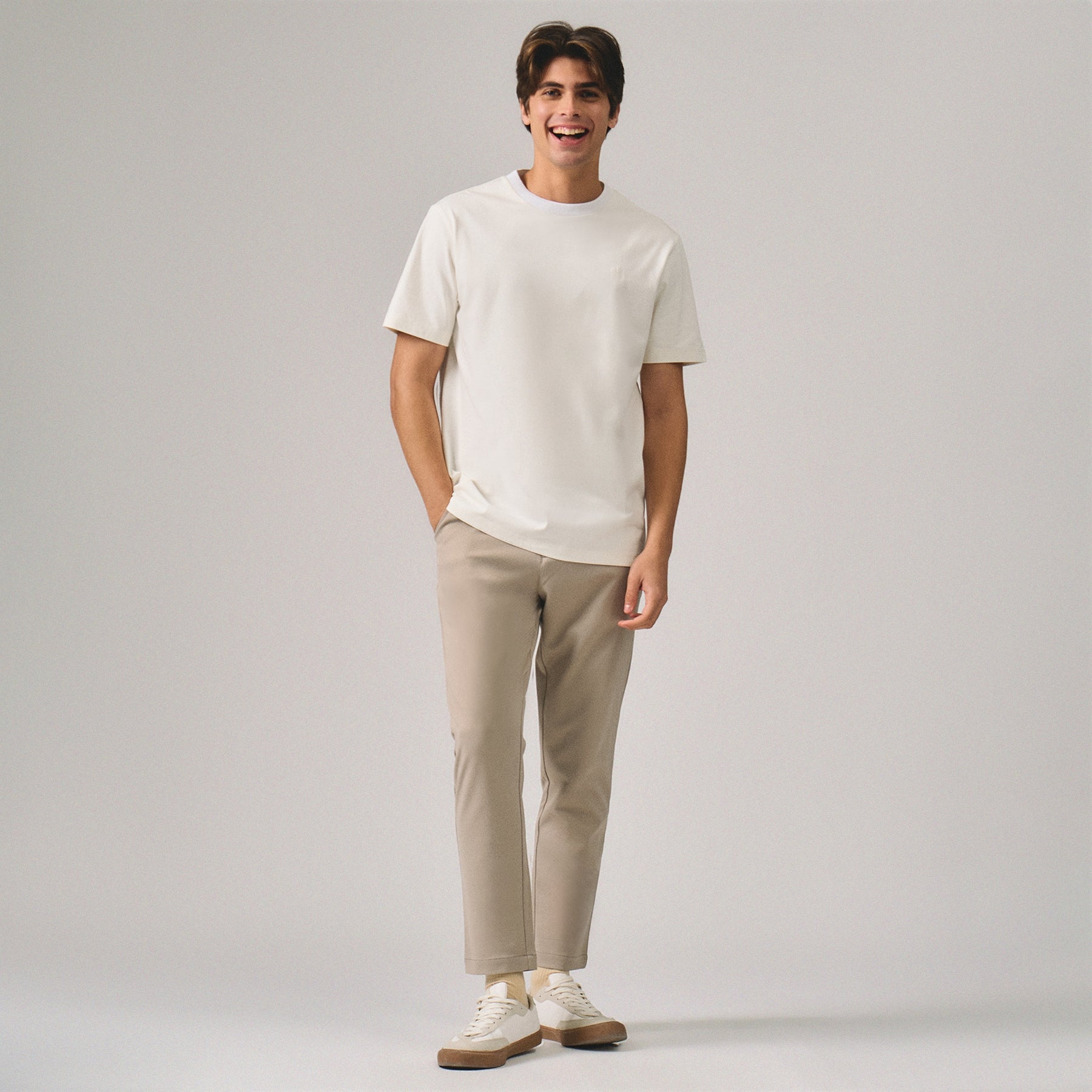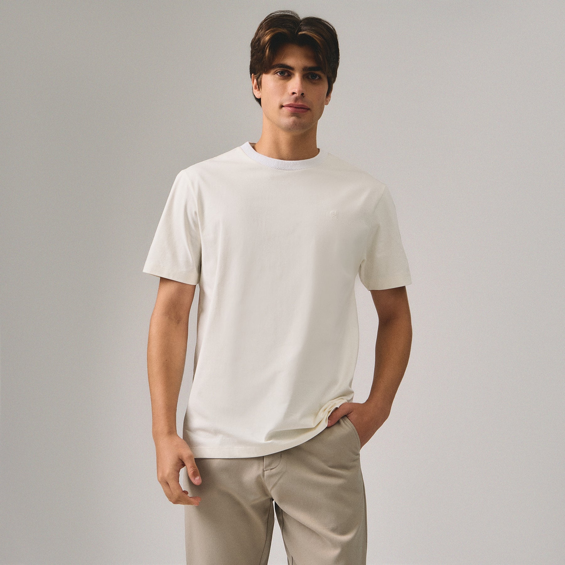 This regular fit T-shirt features a jacquard neck band crafted from Sorona, a sustainable fabric known for its softness and durability. Designed for comfort and everyday wear, it offers a refined look with breathable material that maintains shape wash after wash. Ideal for those seeking a stylish yet practical wardrobe staple that combines eco-friendly innovation with classic fit.