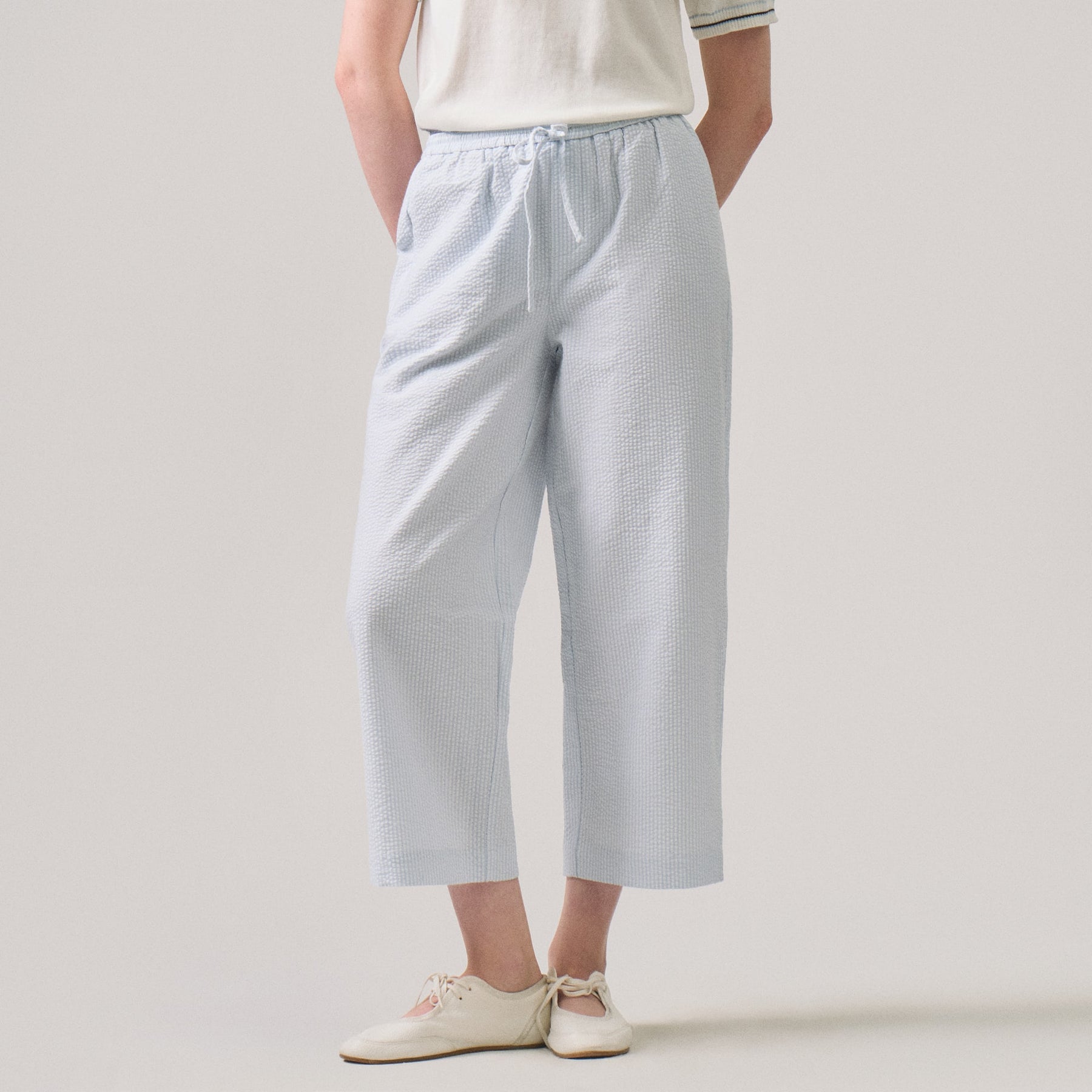 Elevate your casual wardrobe with these Seersucker Drawstring Trousers, featuring a textured weave that adds visual interest to any outfit. The high-waist, straight-leg silhouette offers a flattering fit, while the drawstring waist ensures comfort and adjustability. Crafted from 100% polyester, these trousers are easy to care for and perfect for warm-weather styling.