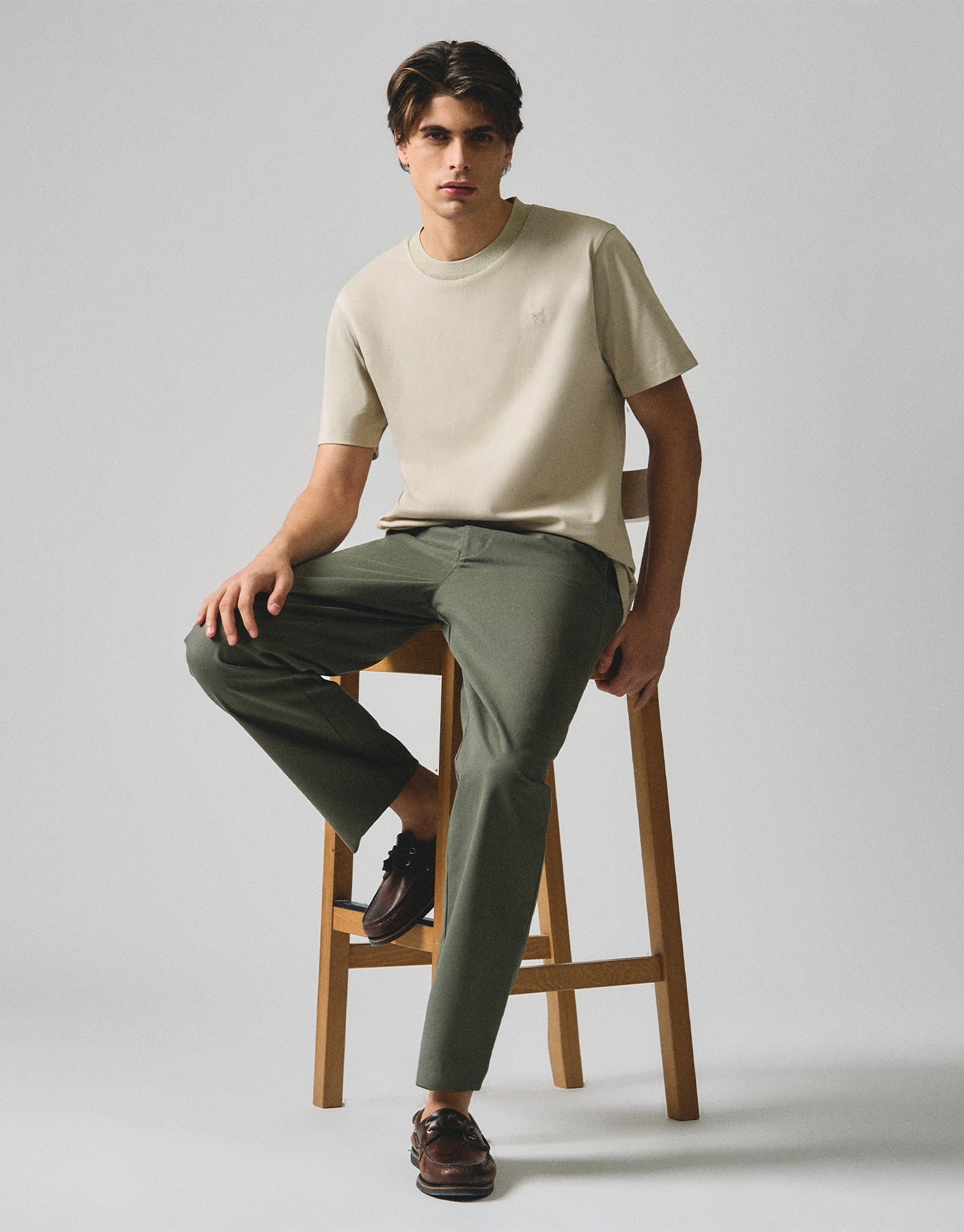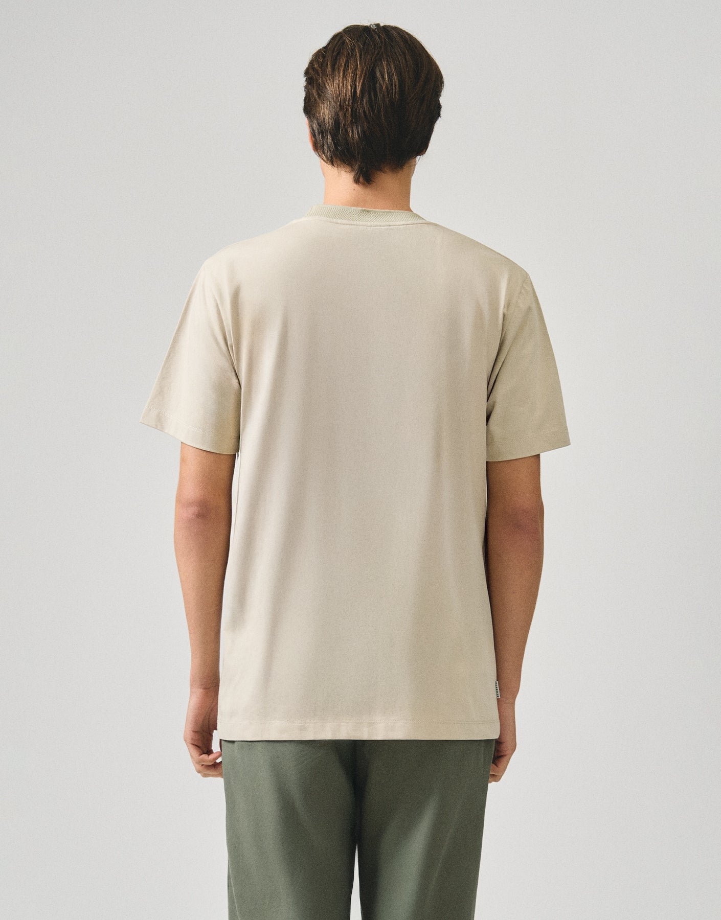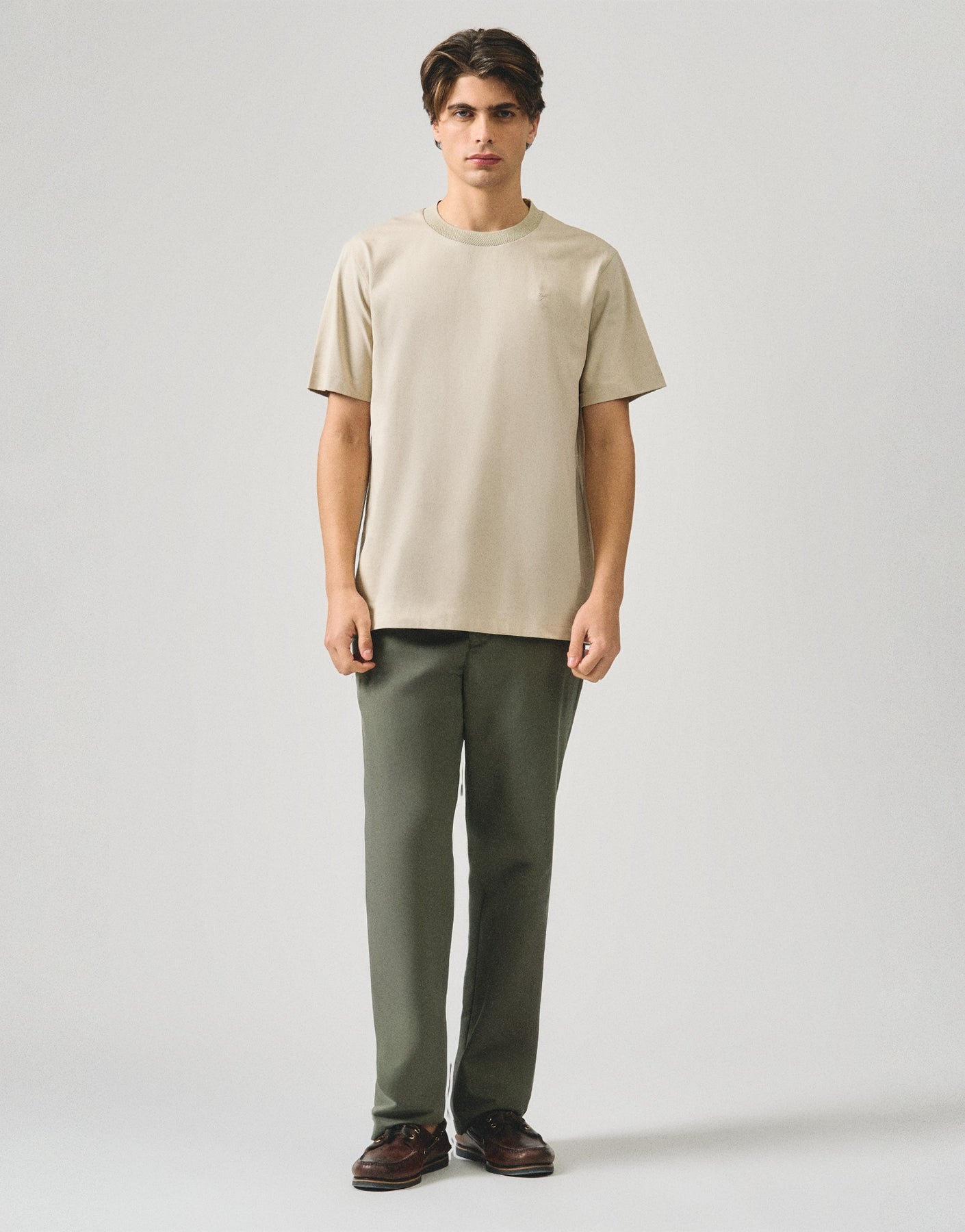 This regular fit T-shirt features a jacquard neck band crafted from Sorona, a sustainable fabric known for its softness and durability. Designed for comfort and everyday wear, it offers a refined look with breathable material that maintains shape wash after wash. Ideal for those seeking a stylish yet practical wardrobe staple that combines eco-friendly innovation with classic fit.