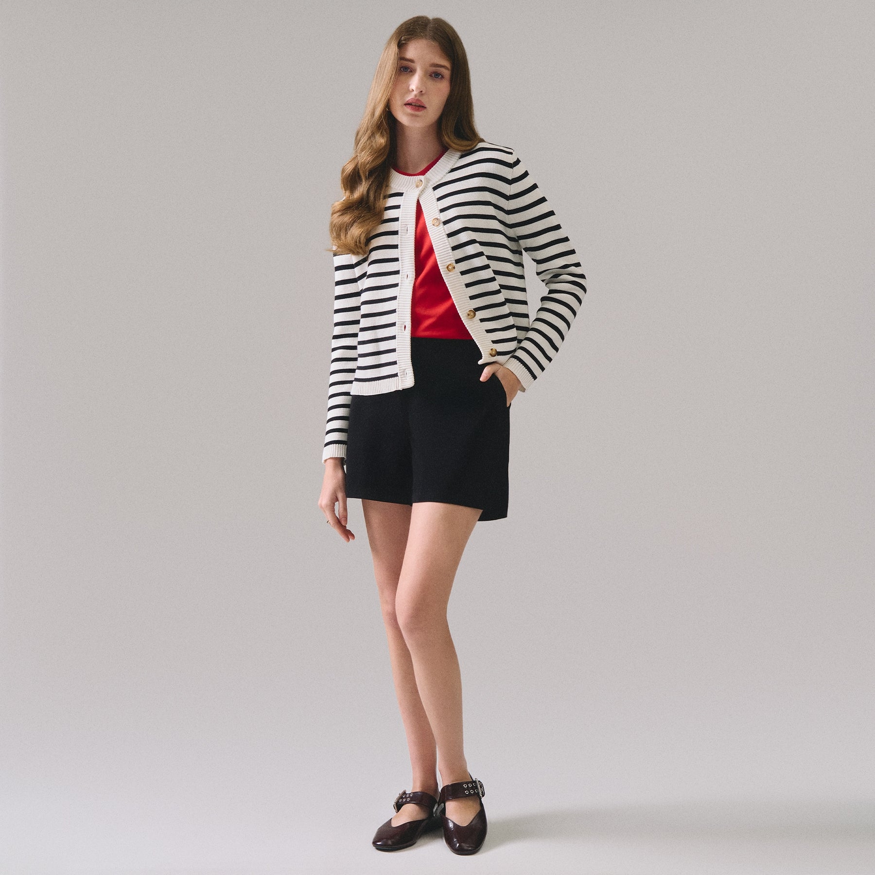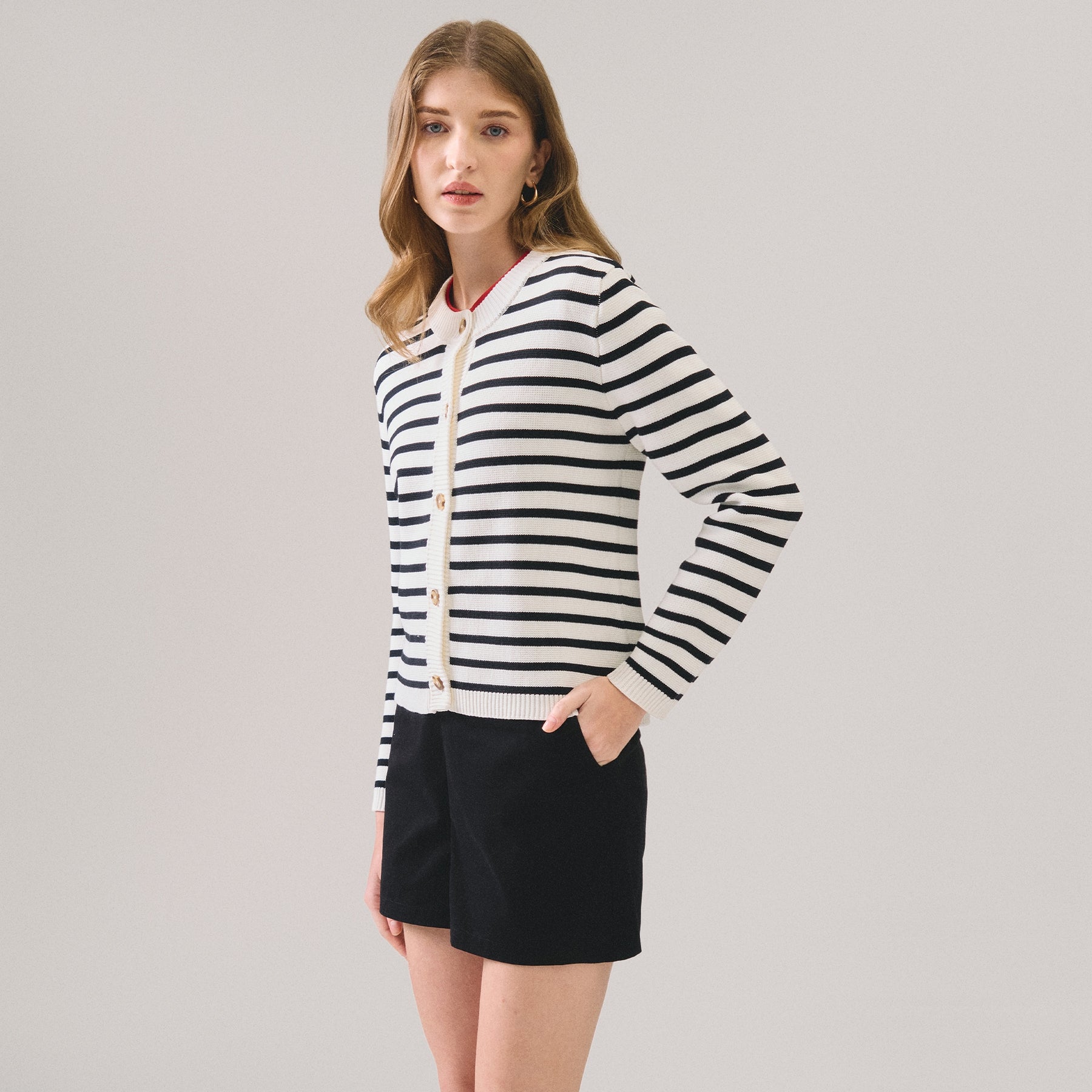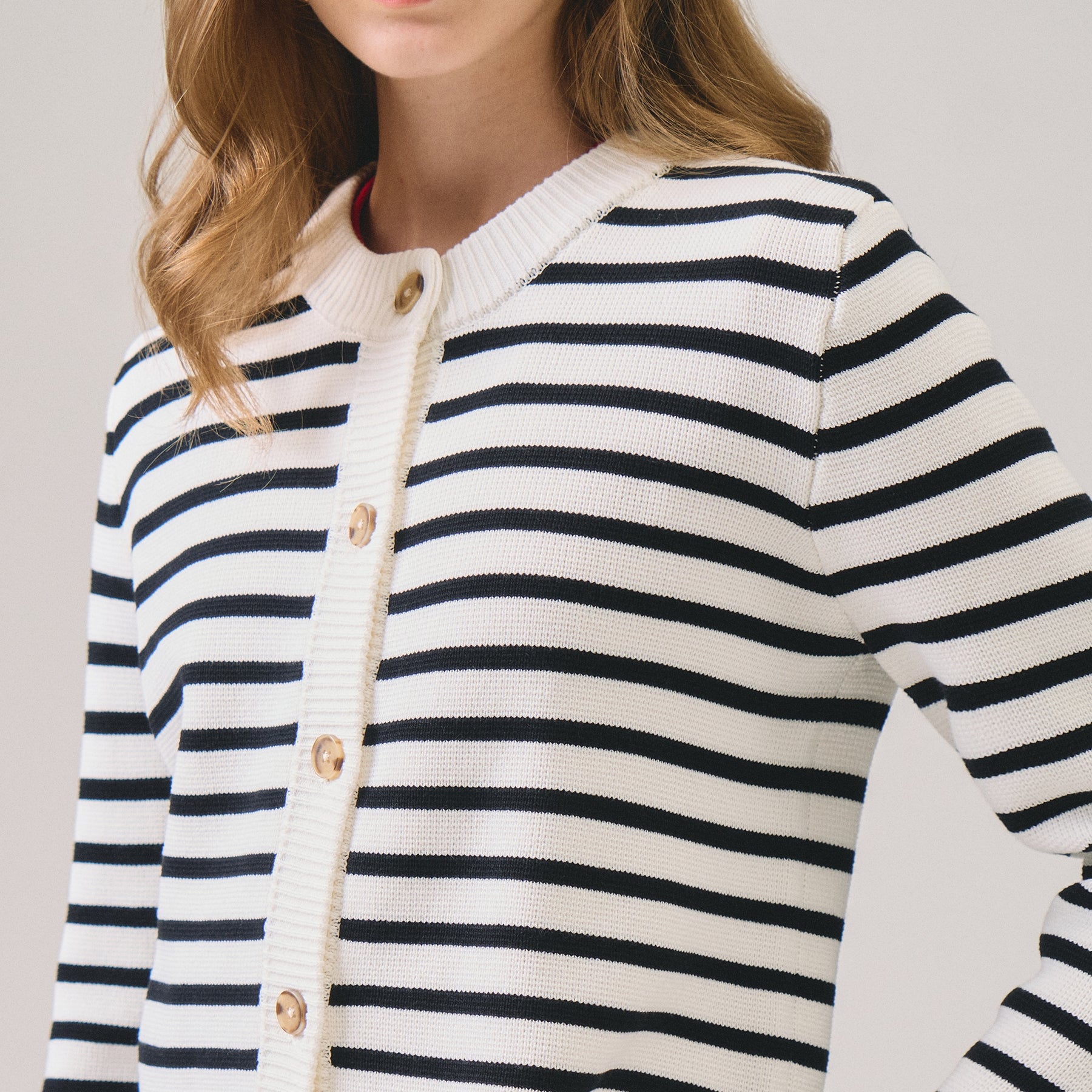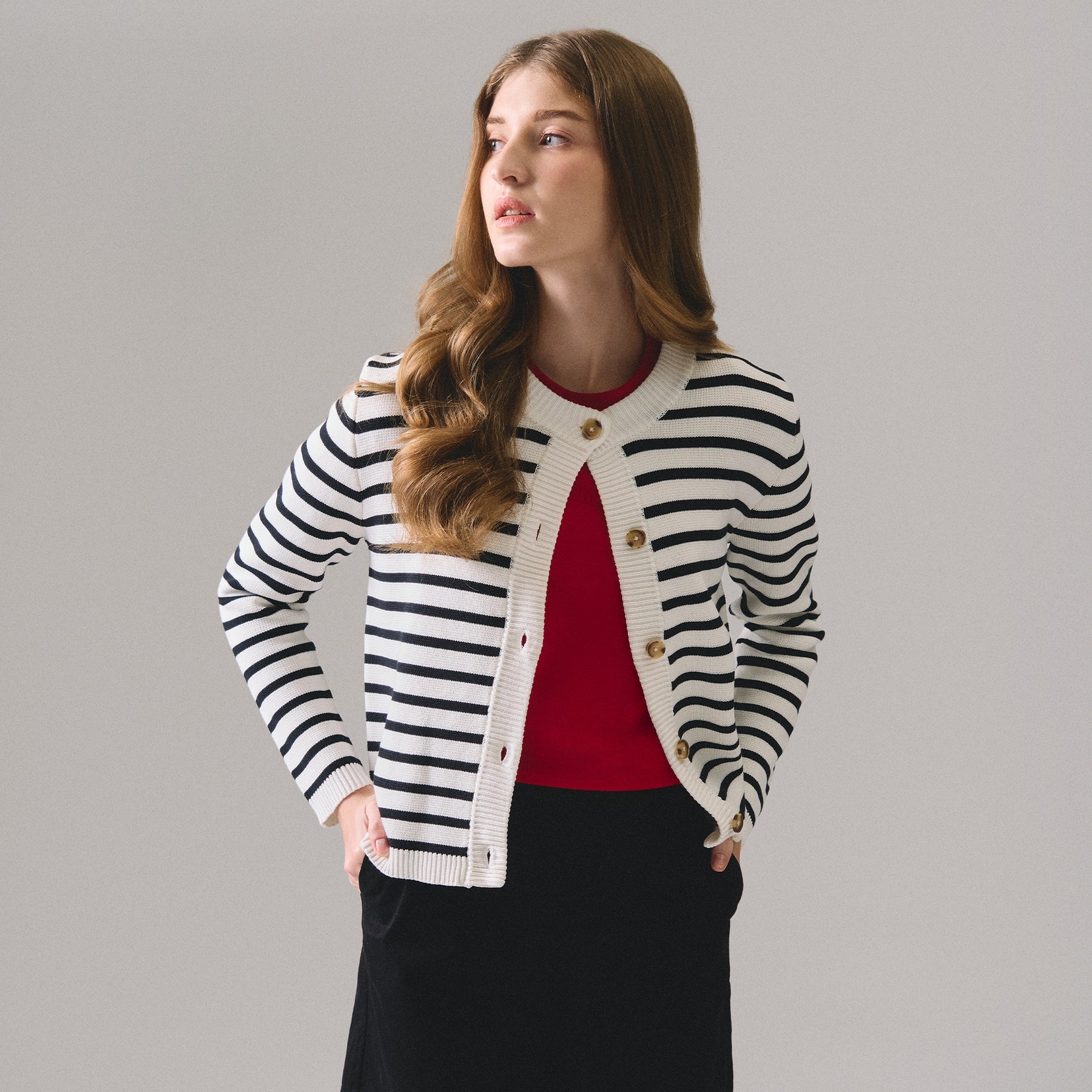 Striped Cardigan A versatile layering essential that seamlessly transitions across seasons. This striped cardigan features a classic pattern that pairs effortlessly with both casual and polished looks. The structured knit construction provides reliable durability while maintaining a comfortable fit for everyday wear. Perfect for layering over tees, dresses, or worn open as a standalone piece. An investment piece that anchors any wardrobe with timeless style and practical functionality.