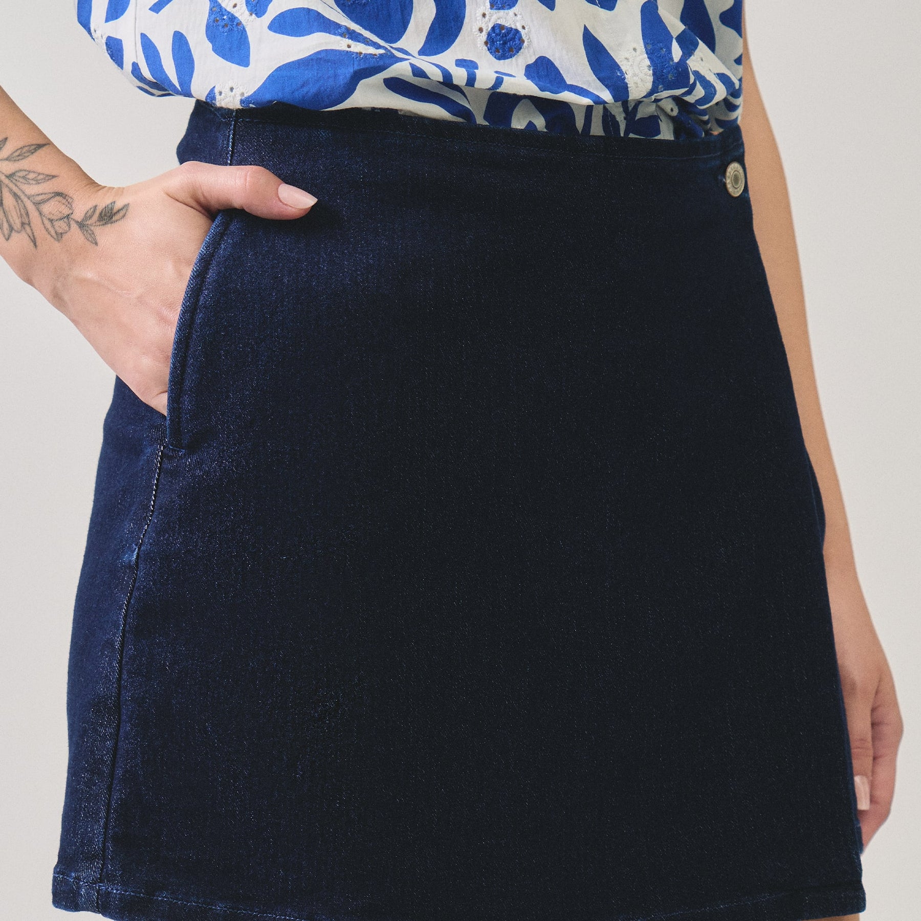 Dark Wash Denim Skort Combining the practicality of shorts with the polished aesthetic of a skirt, this dark wash denim skort delivers versatile styling for warm weather. The classic indigo tone pairs effortlessly with casual tees, sneakers, and sandals, while the structured denim fabric ensures durability through repeated wear. The skort silhouette offers freedom of movement without compromising on sophistication, making it an essential piece for those seeking comfort and style in equal measure.