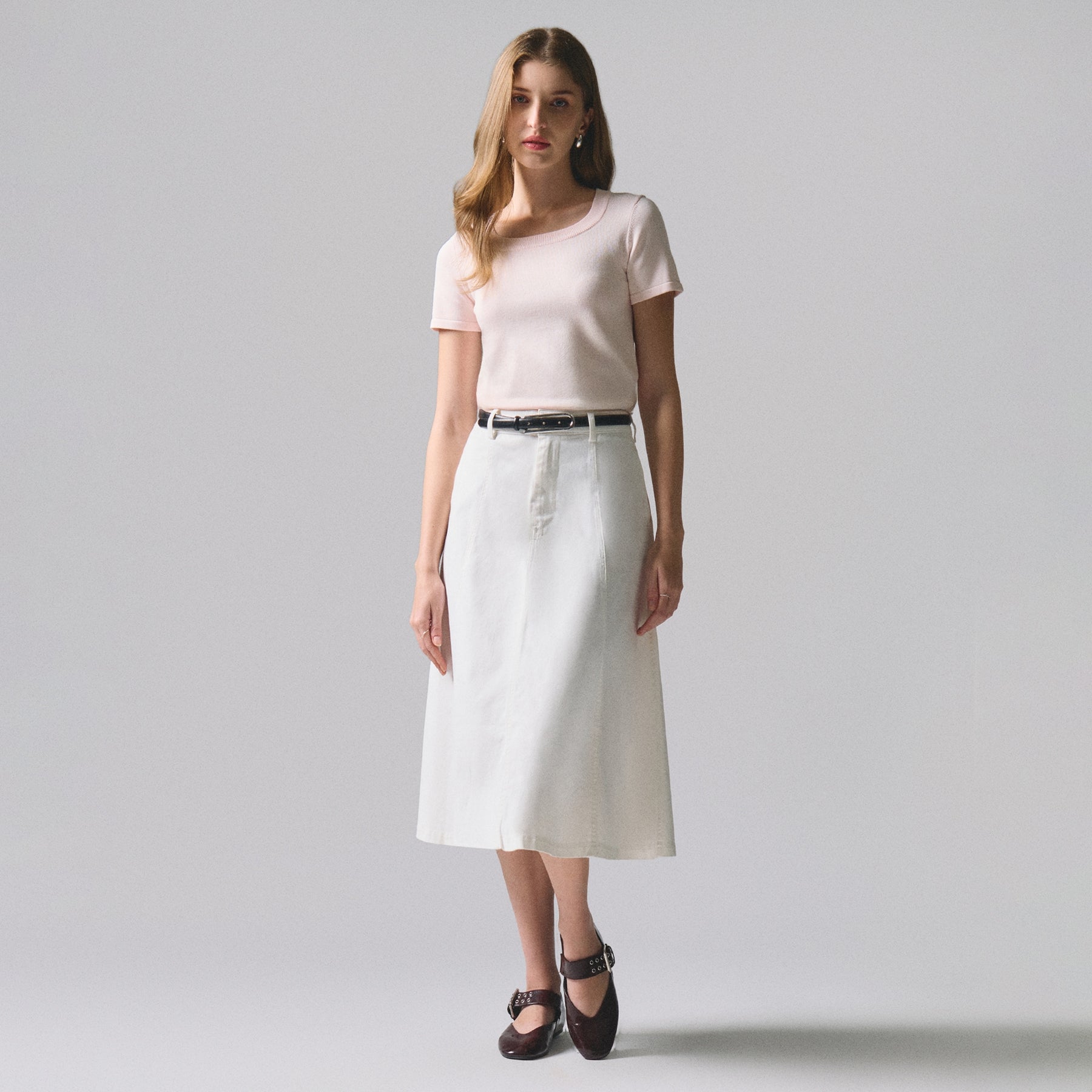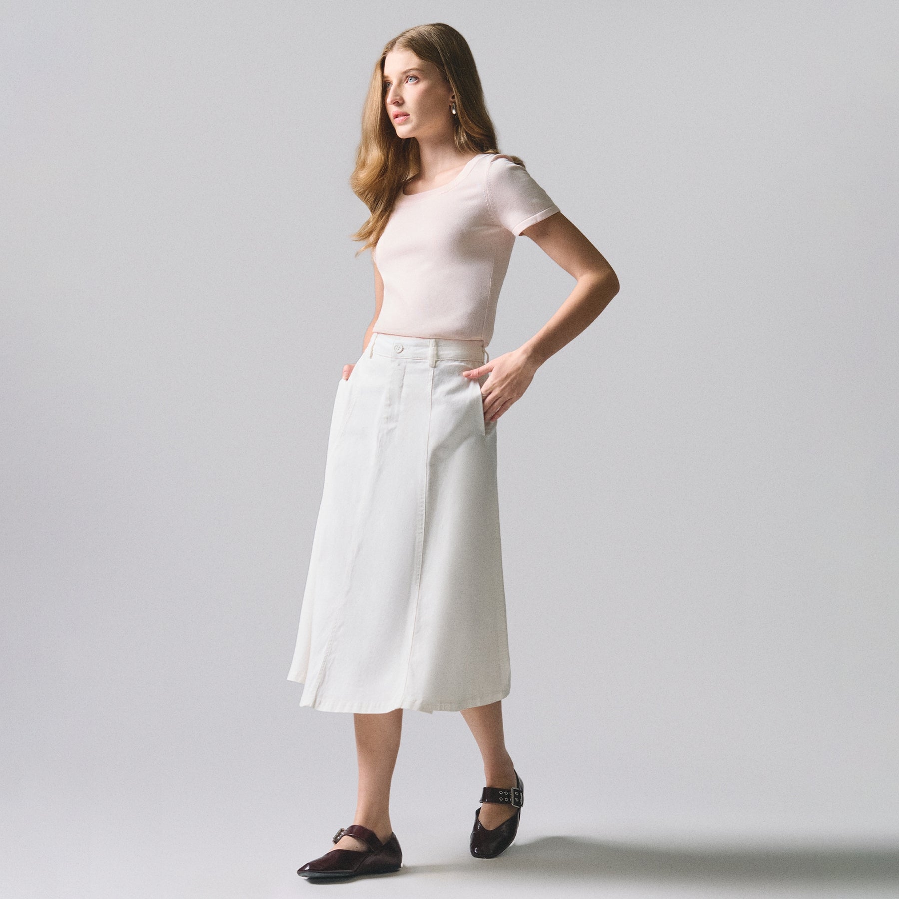 Elevate your wardrobe with this sophisticated midi skirt, designed with strategic paneling that creates a flattering silhouette. The panel construction offers both visual interest and structural support, ensuring a polished appearance from every angle. Perfect for transitioning between seasons, this versatile piece pairs effortlessly with everything from casual tops to refined blouses. The midi length provides timeless elegance while maintaining modern appeal, making it an essential addition to any discerning wardrobe.