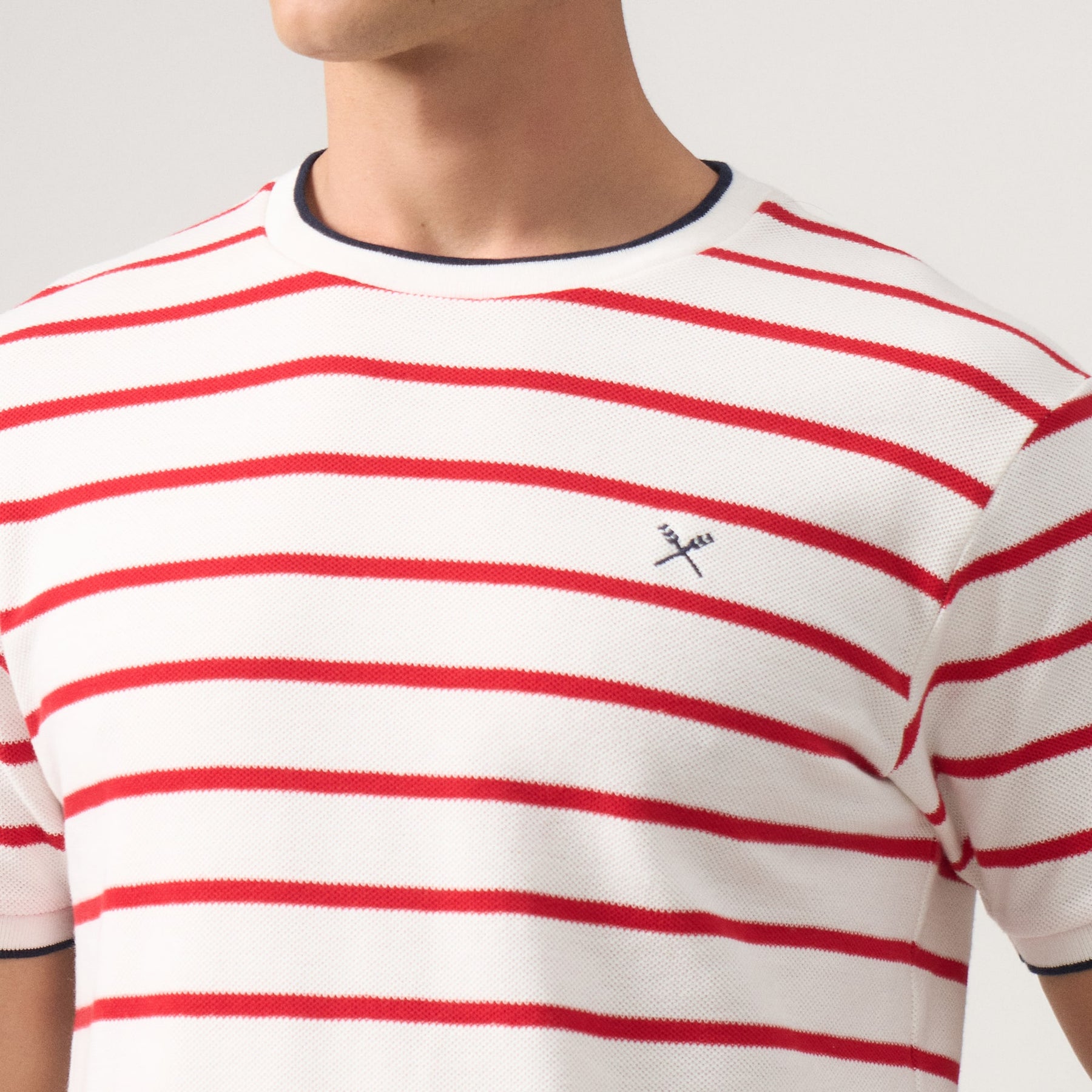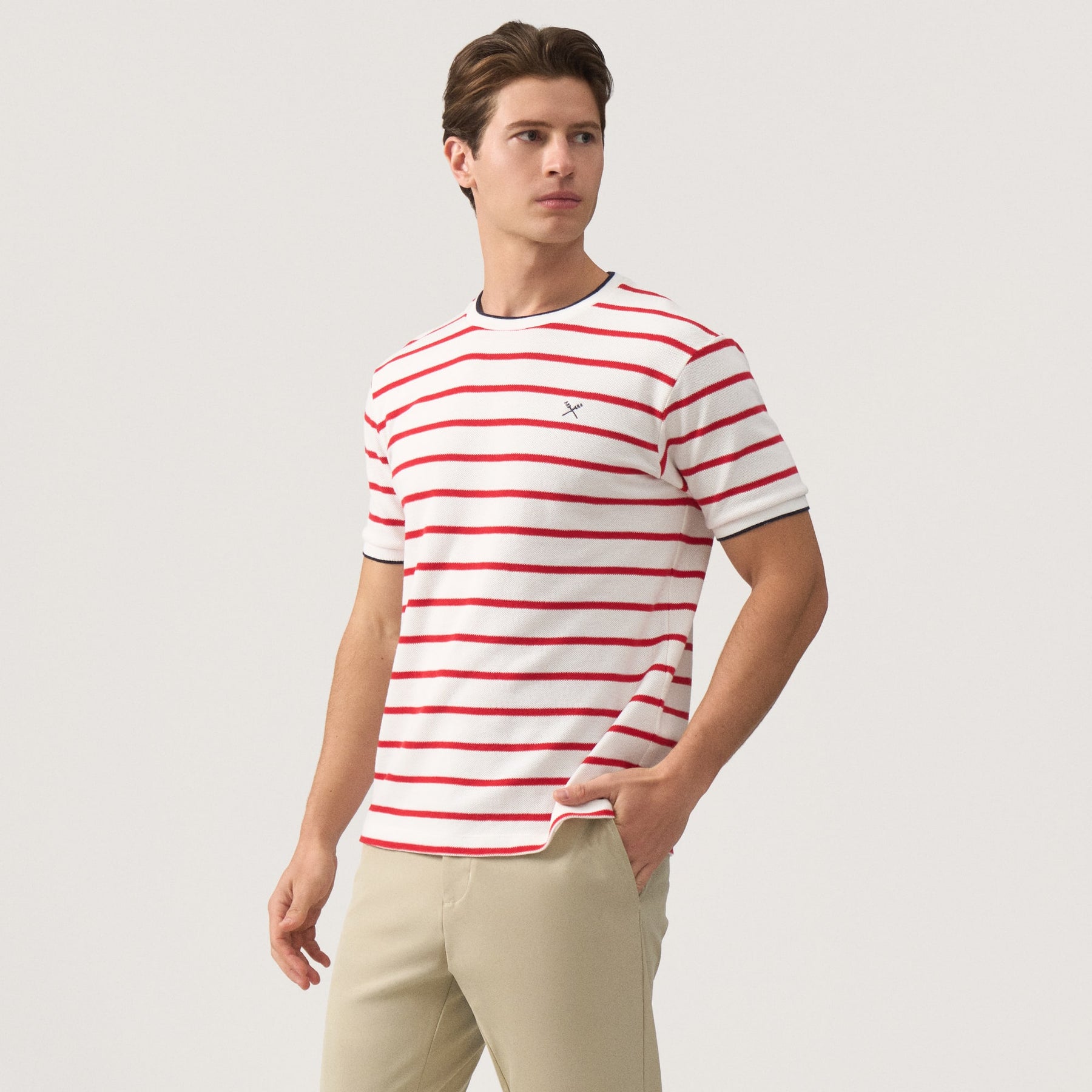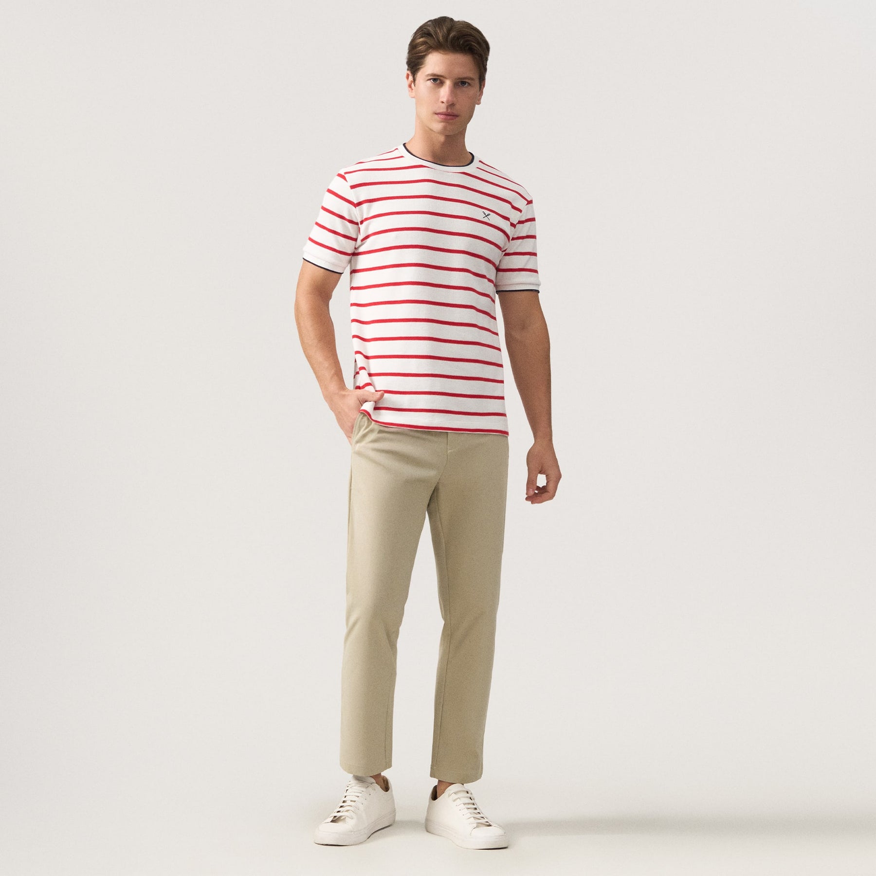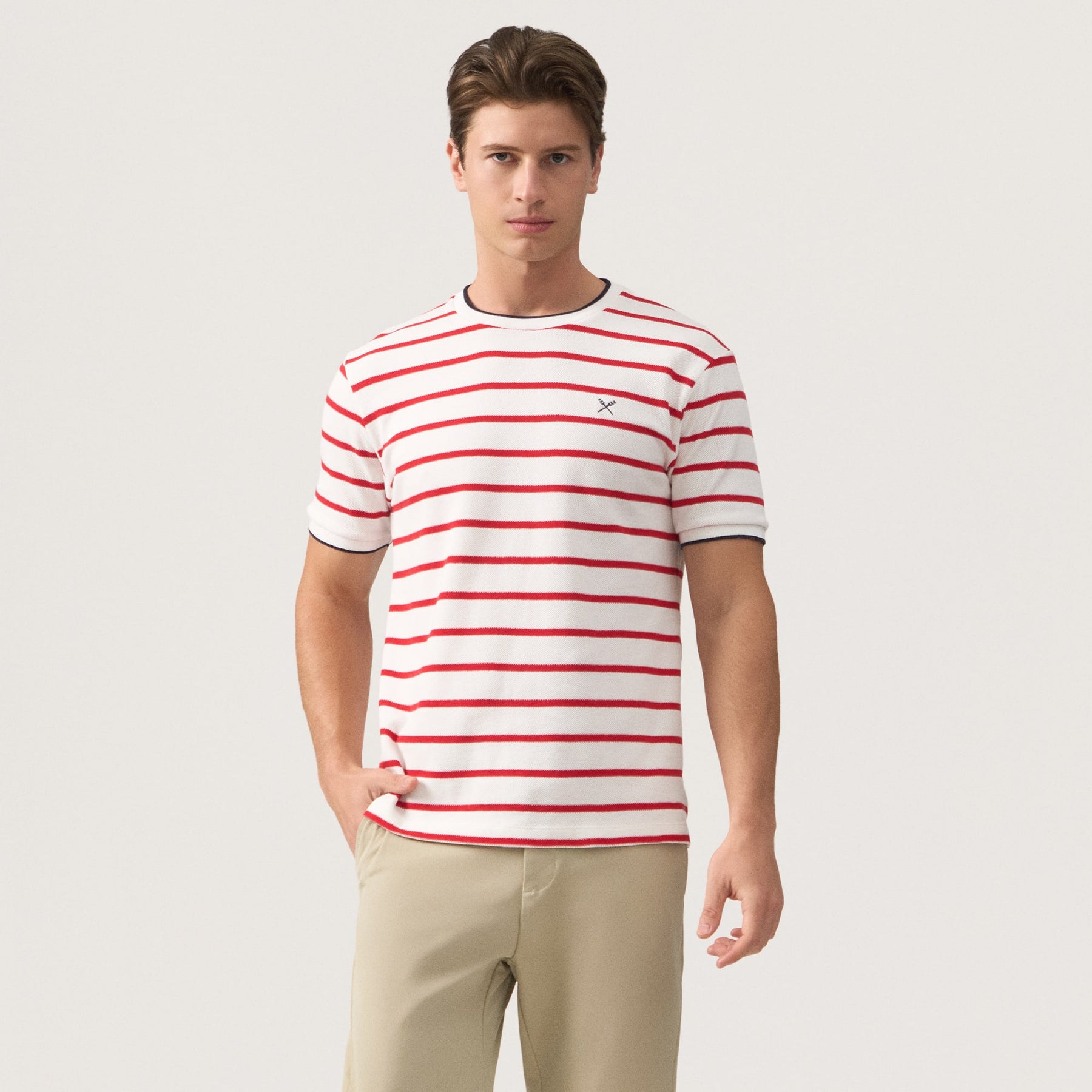 Crafted from premium honeycomb pique fabric, this regular fit striped t-shirt delivers exceptional breathability and durability for everyday wear. The classic striped pattern is elevated by refined contrast tipping at the collar and cuffs, adding a sophisticated edge to a versatile wardrobe staple. The structured honeycomb weave resists wrinkles and maintains its shape through repeated washing, while the relaxed regular fit ensures comfortable movement without excess fabric. Perfect for layering or wearing solo, this piece transitions seamlessly from casual outings to smart-casual settings.