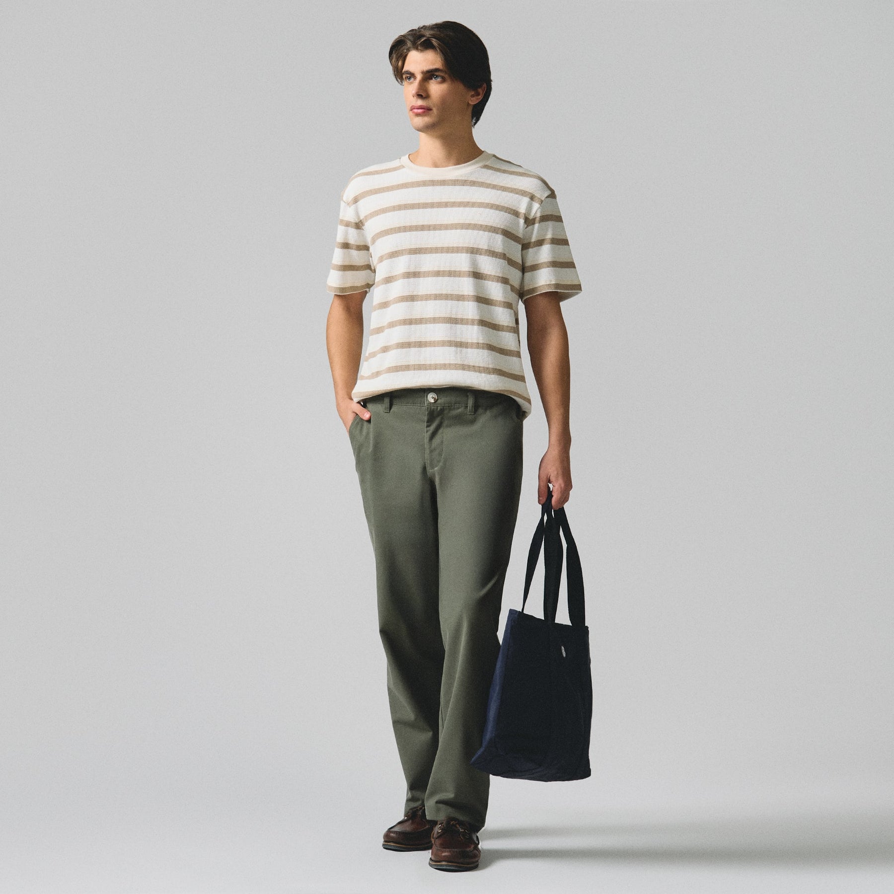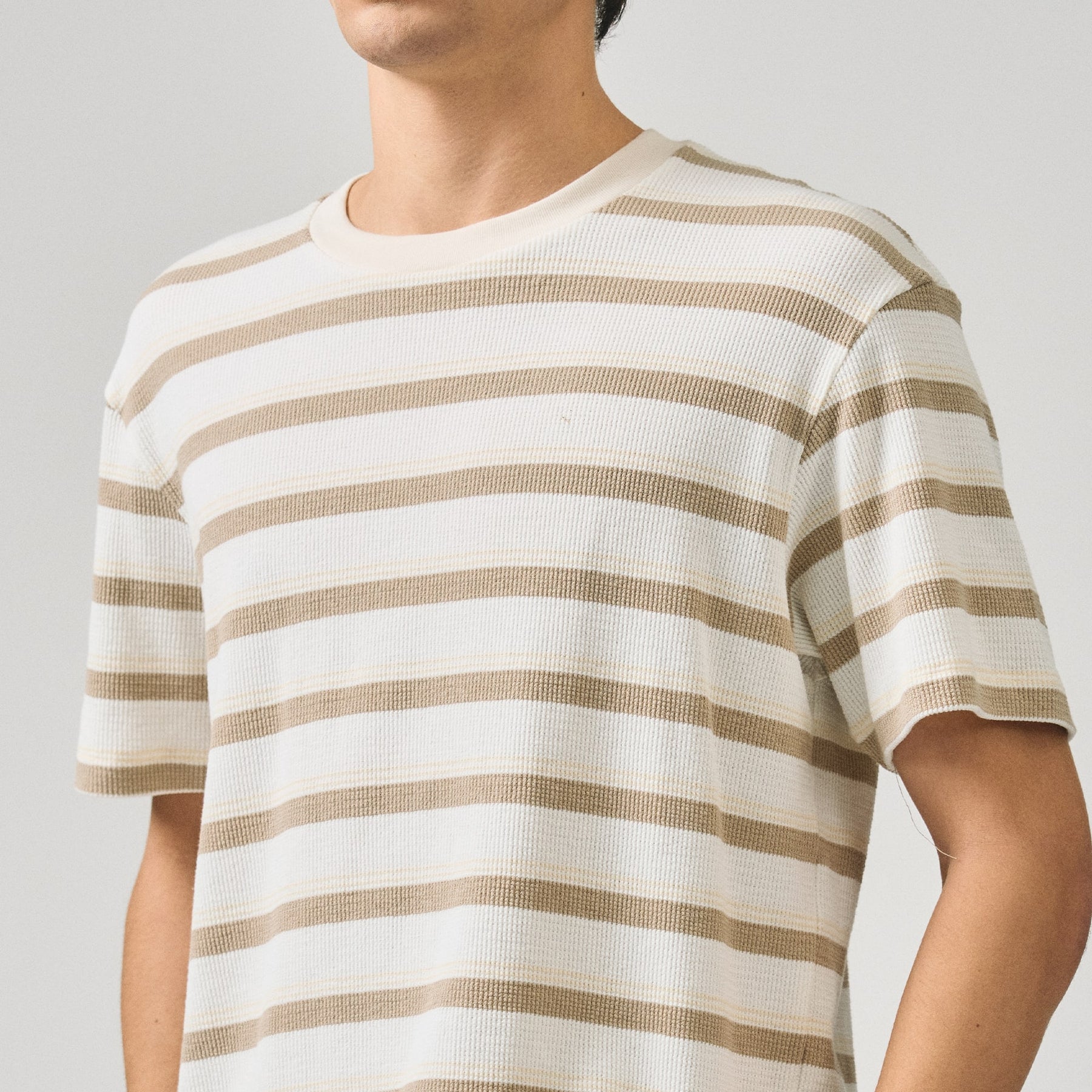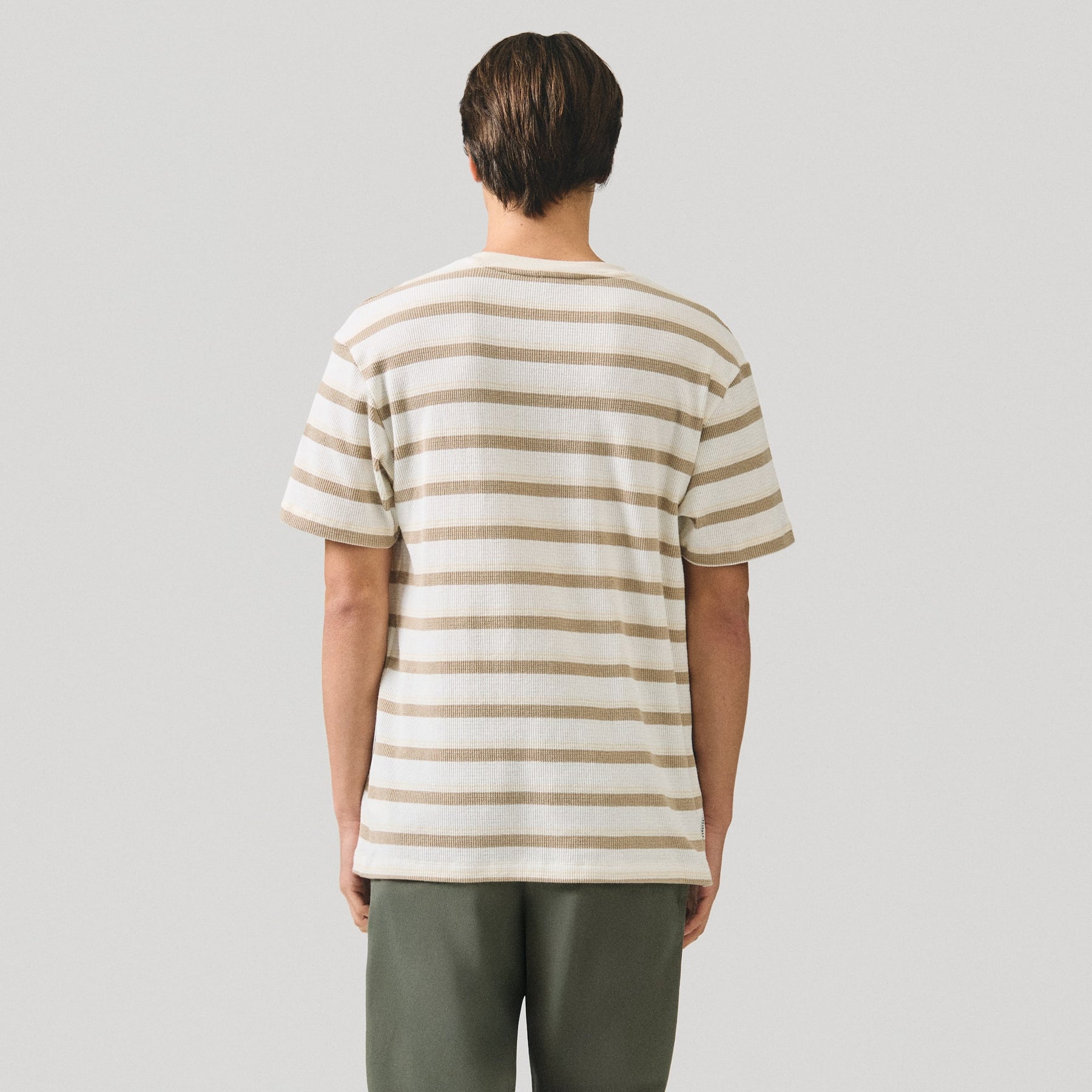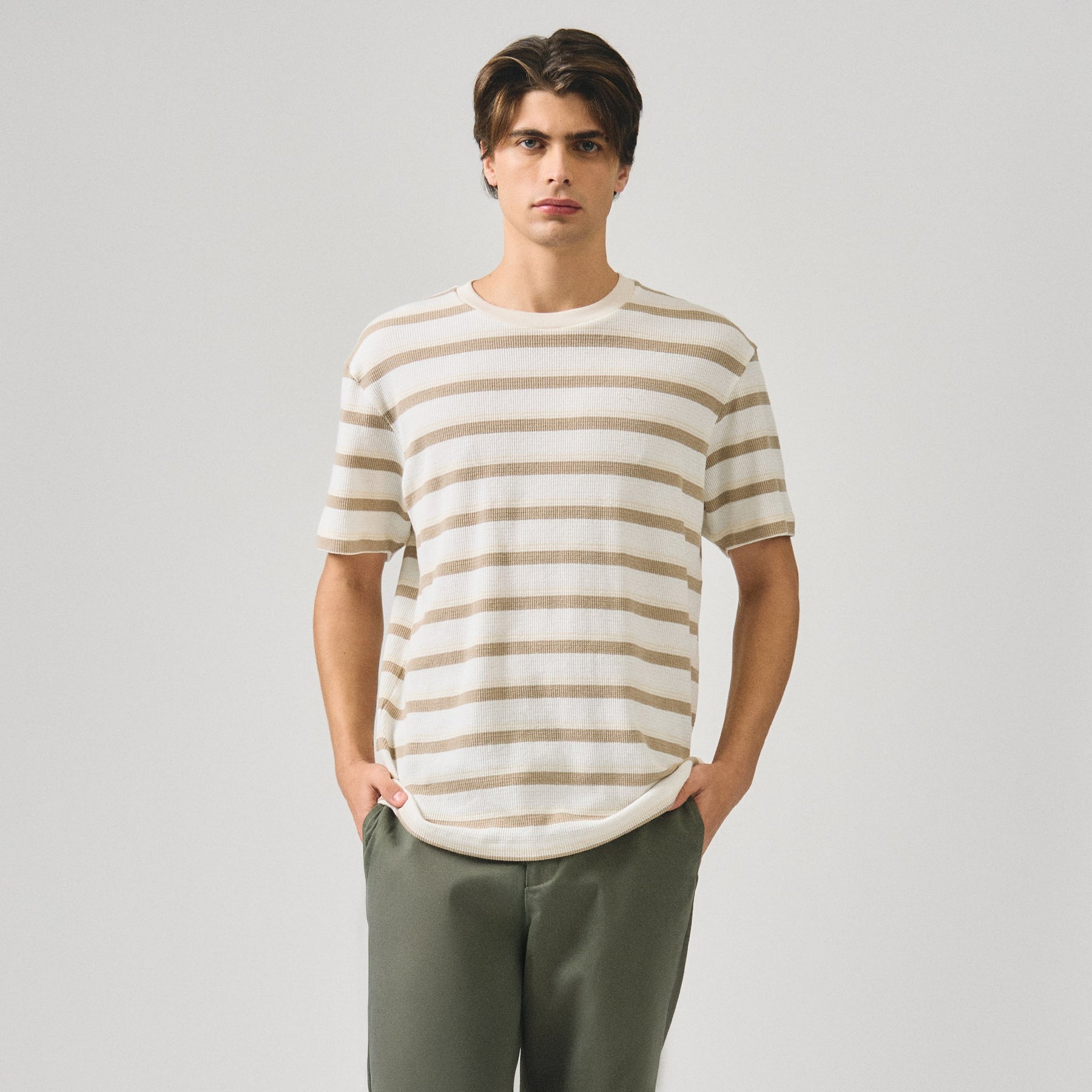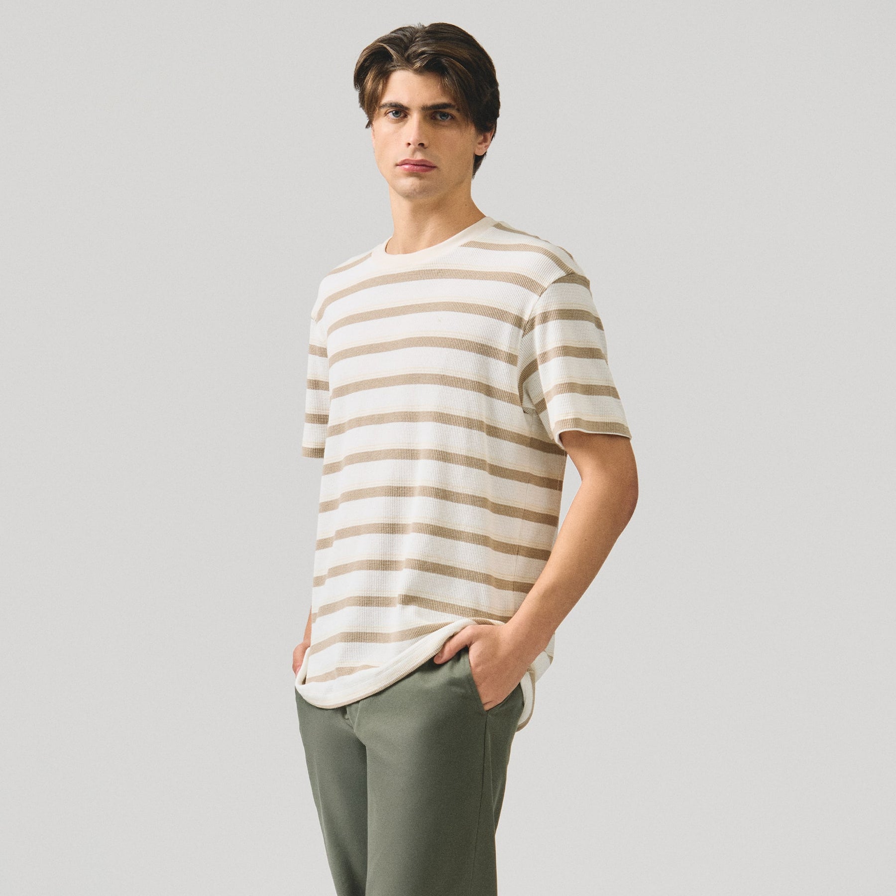 Crafted from substantial heavy jersey fabric, this regular fit t-shirt delivers exceptional durability and comfort for everyday wear. The embossed stripe jacquard detail adds sophisticated texture and visual interest, elevating the piece beyond basic basics. The relaxed silhouette ensures unrestricted movement while maintaining a polished appearance. Ideal for layering or wearing solo, this versatile staple transitions seamlessly from casual outings to relaxed professional settings. The structured fabric resists wrinkles and maintains its shape through repeated wear and washing, making it a reliable investment for a well-rounded wardrobe.