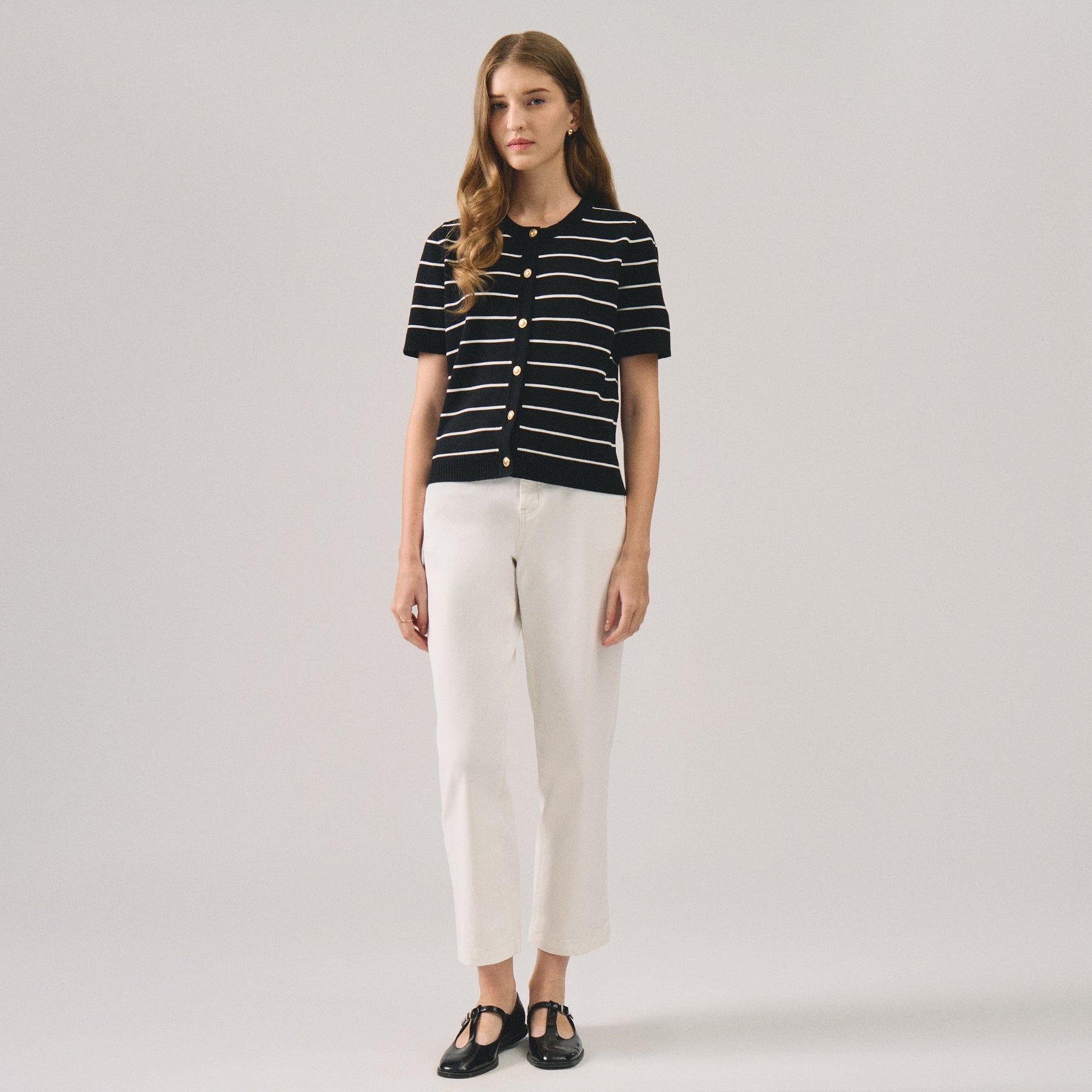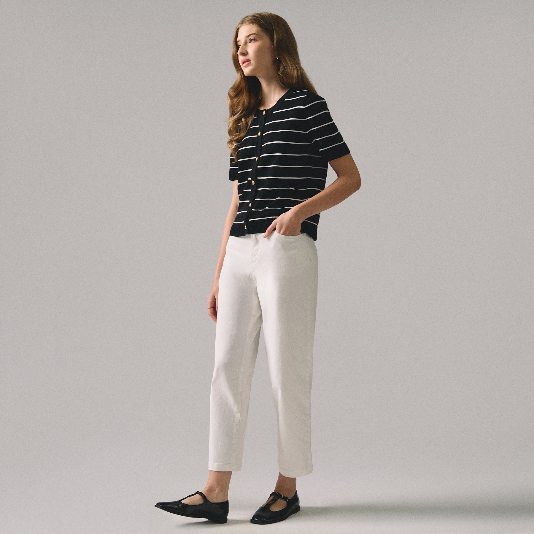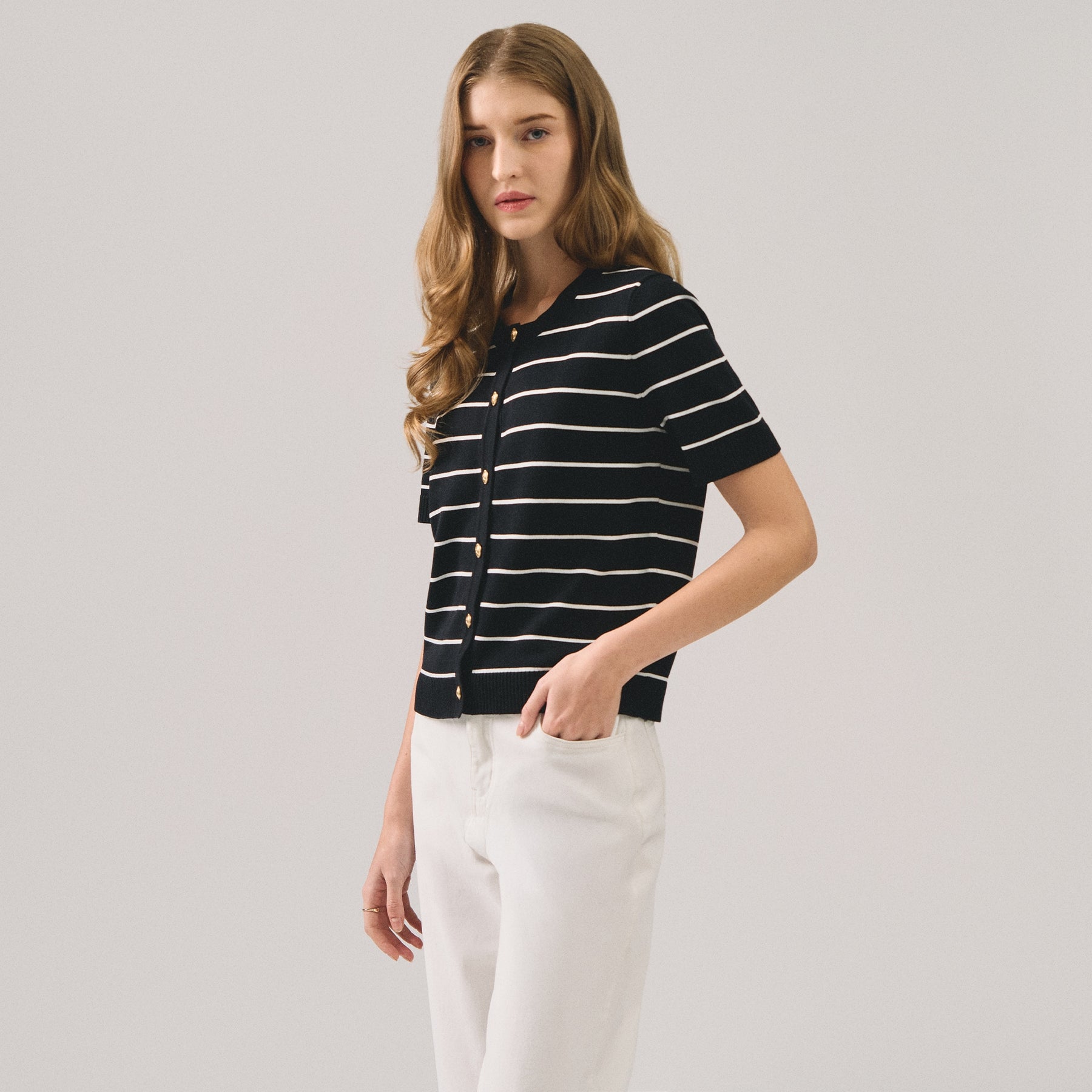 Elevate your everyday wardrobe with this versatile striped button-down knit top. Crafted from quality knit fabric, it delivers a refined silhouette that transitions seamlessly from casual to polished occasions. The classic striped pattern adds visual interest while remaining timeless, while functional buttons provide easy layering and styling flexibility. Perfect for pairing with tailored trousers, denim, or skirts, this piece offers the comfort of knitwear with the structured appeal of a button-front design. A sophisticated essential that works harder in your rotation.