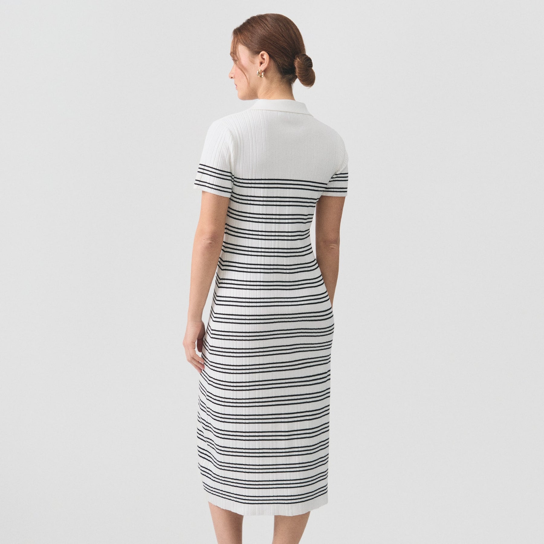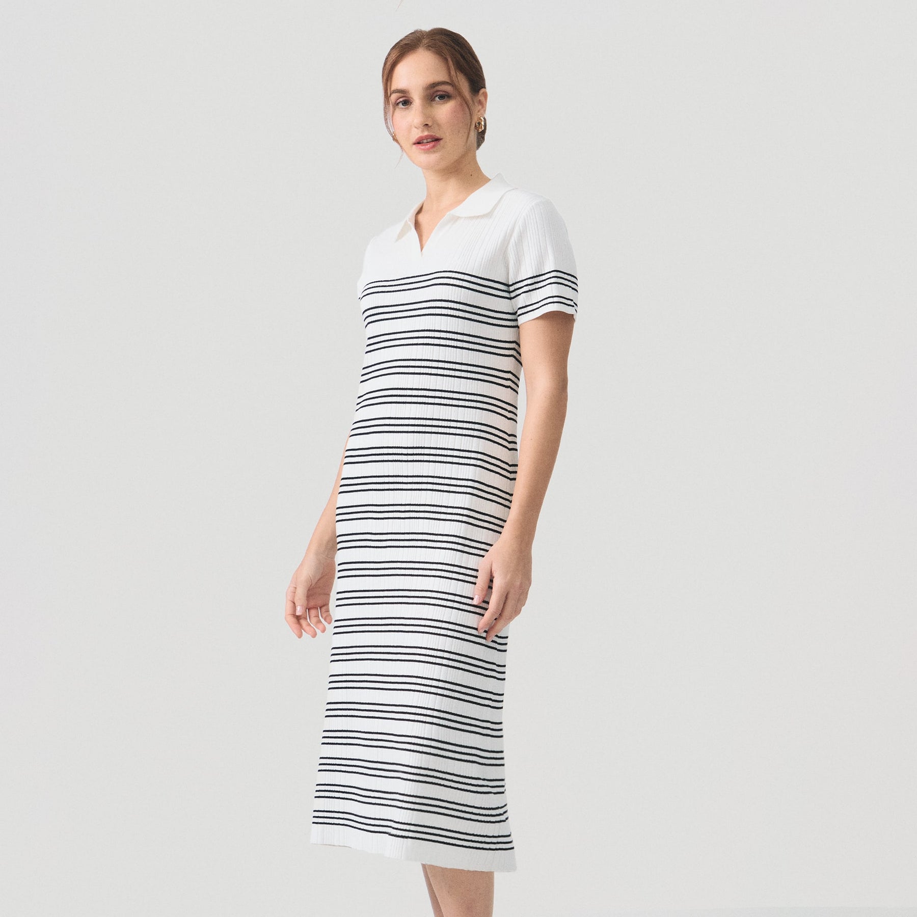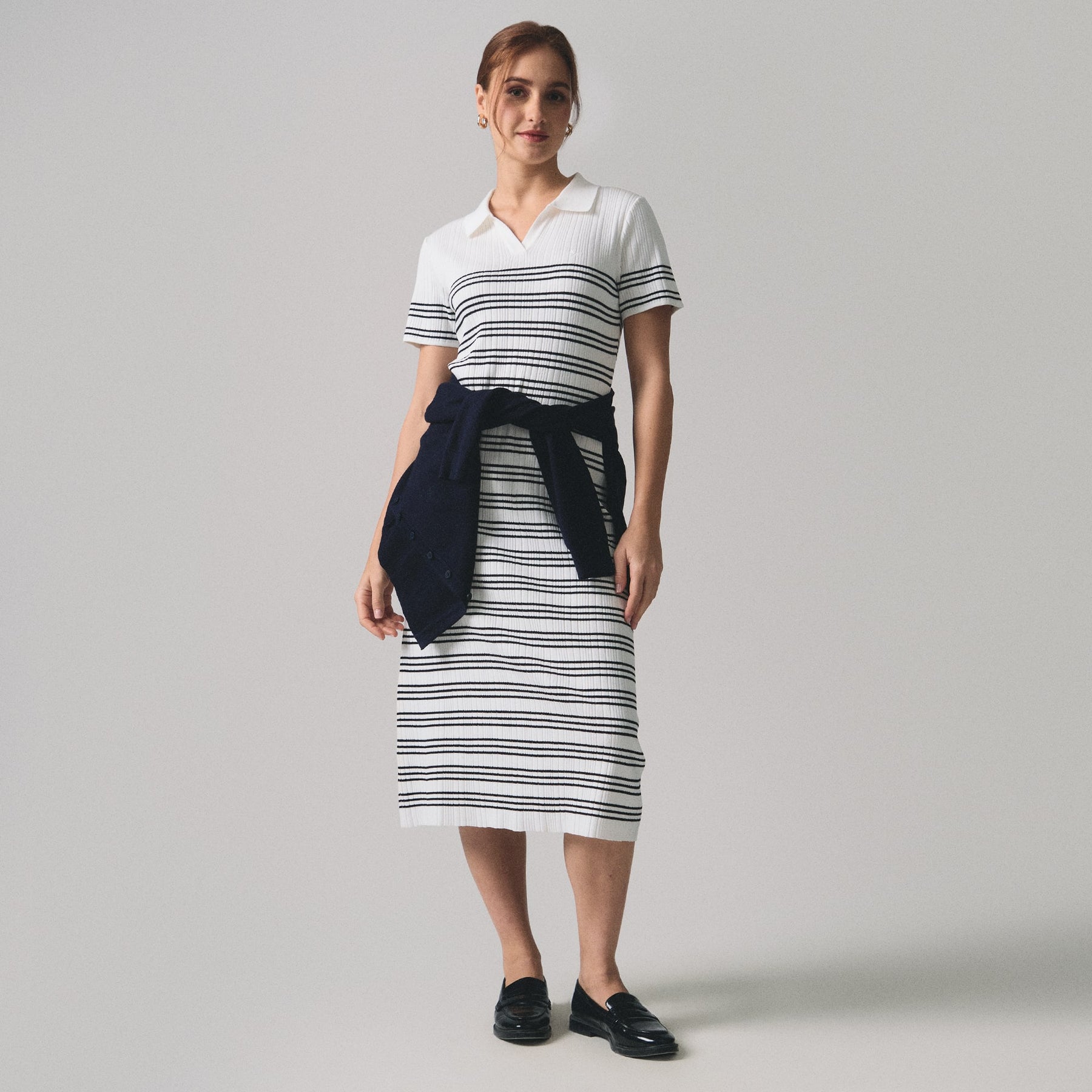 Timeless elegance meets effortless sophistication in this Breton striped midi dress. The classic navy and white horizontal stripes evoke nautical charm while maintaining refined versatility for any occasion. Cut to a flattering midi length, this piece transitions seamlessly from casual daytime wear to evening sophistication. The structured fabric provides comfortable support throughout the day, while the iconic stripe pattern ensures you'll reach for it season after season. A wardrobe essential that transcends trends.