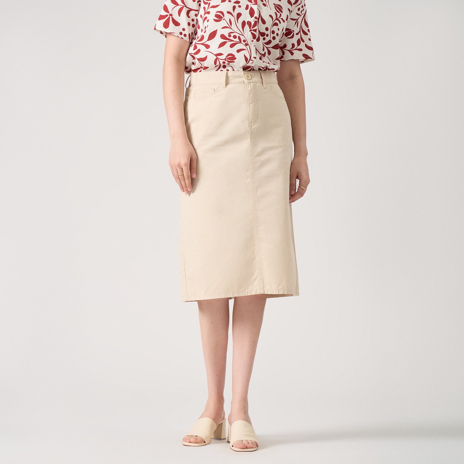 This midi skirt features a back slit for ease of movement and a subtle touch of sophistication. Its versatile length and tailored fit make it ideal for both professional settings and elegant casual wear. Crafted to balance comfort and style, it offers a polished silhouette while allowing breathability and flexibility. Perfect for pairing with diverse tops and footwear to create refined ensembles.