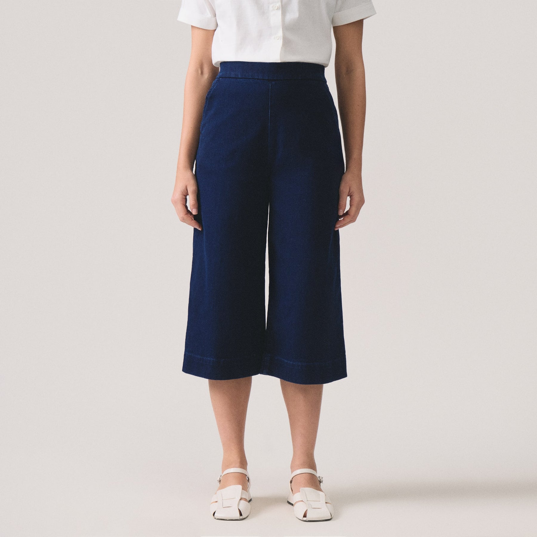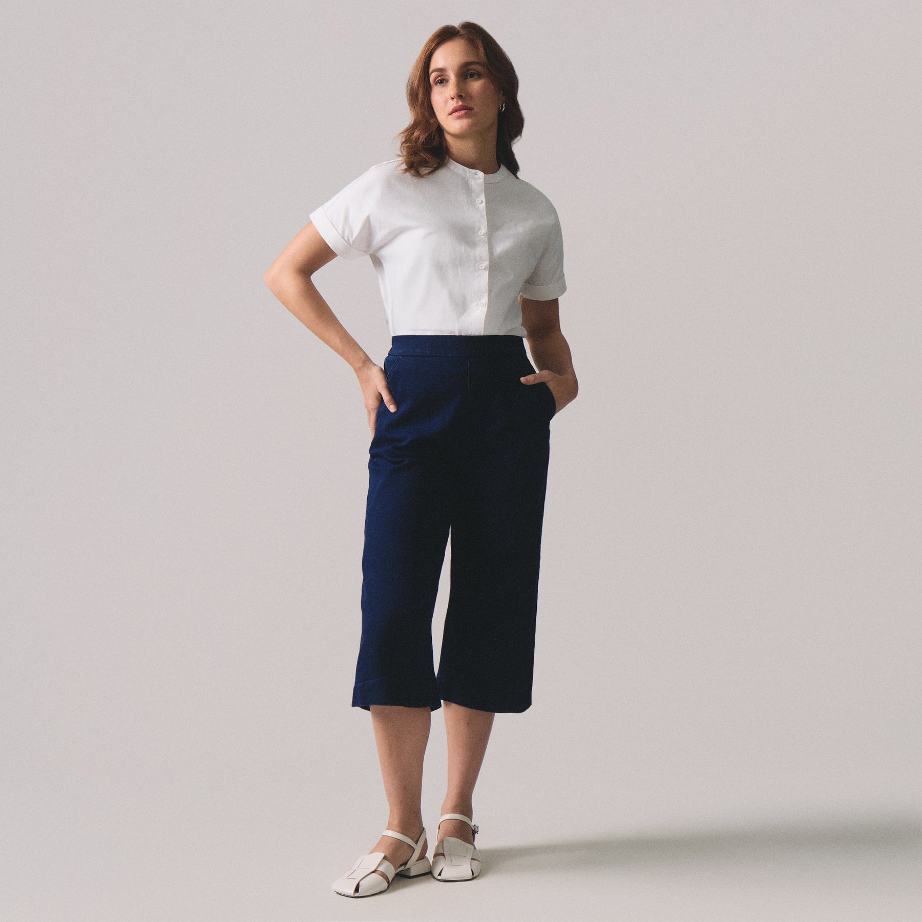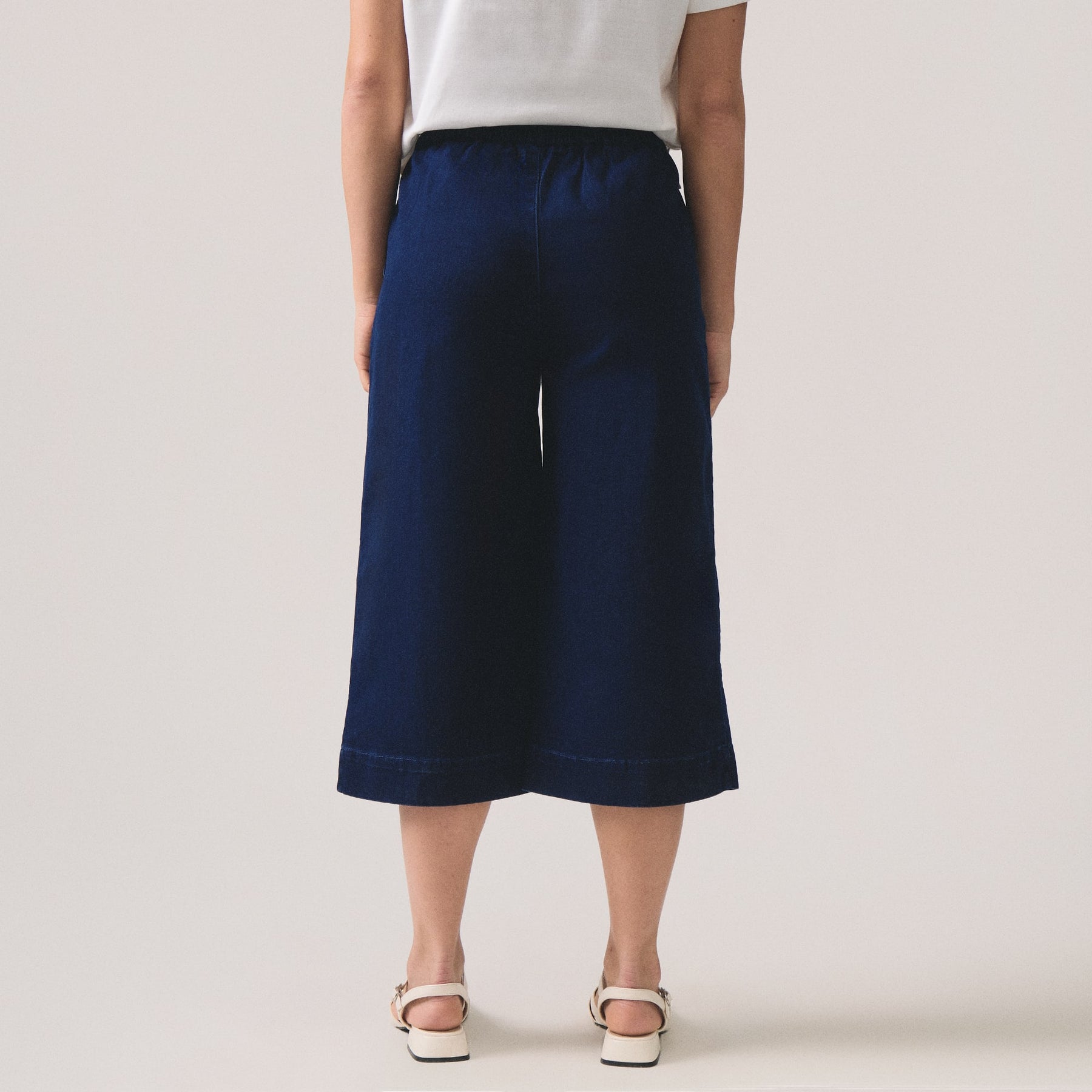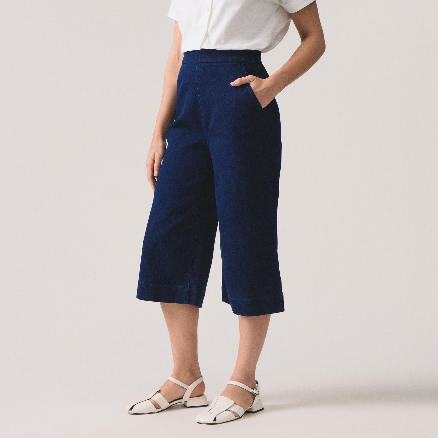 Effortless style meets comfort in these denim pull-up culottes. Crafted from a breathable cotton-blend fabric with just the right amount of stretch, they feature a mid-rise elastic waistband and cropped silhouette perfect for warm weather. The 78% cotton, 20% polyester, and 2% spandex blend ensures durability and flexibility throughout the day. True to size and versatile enough to pair with any top in your wardrobe.